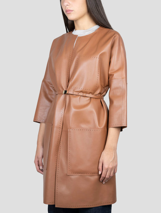 Kiton Women's Handmade Brown Leather Overcoat Italian Premium