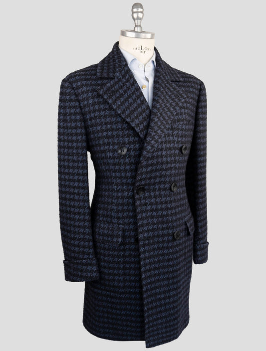 Kiton Handmade Dark Blue Houndstooth Cashmere Alpaca Overcoat